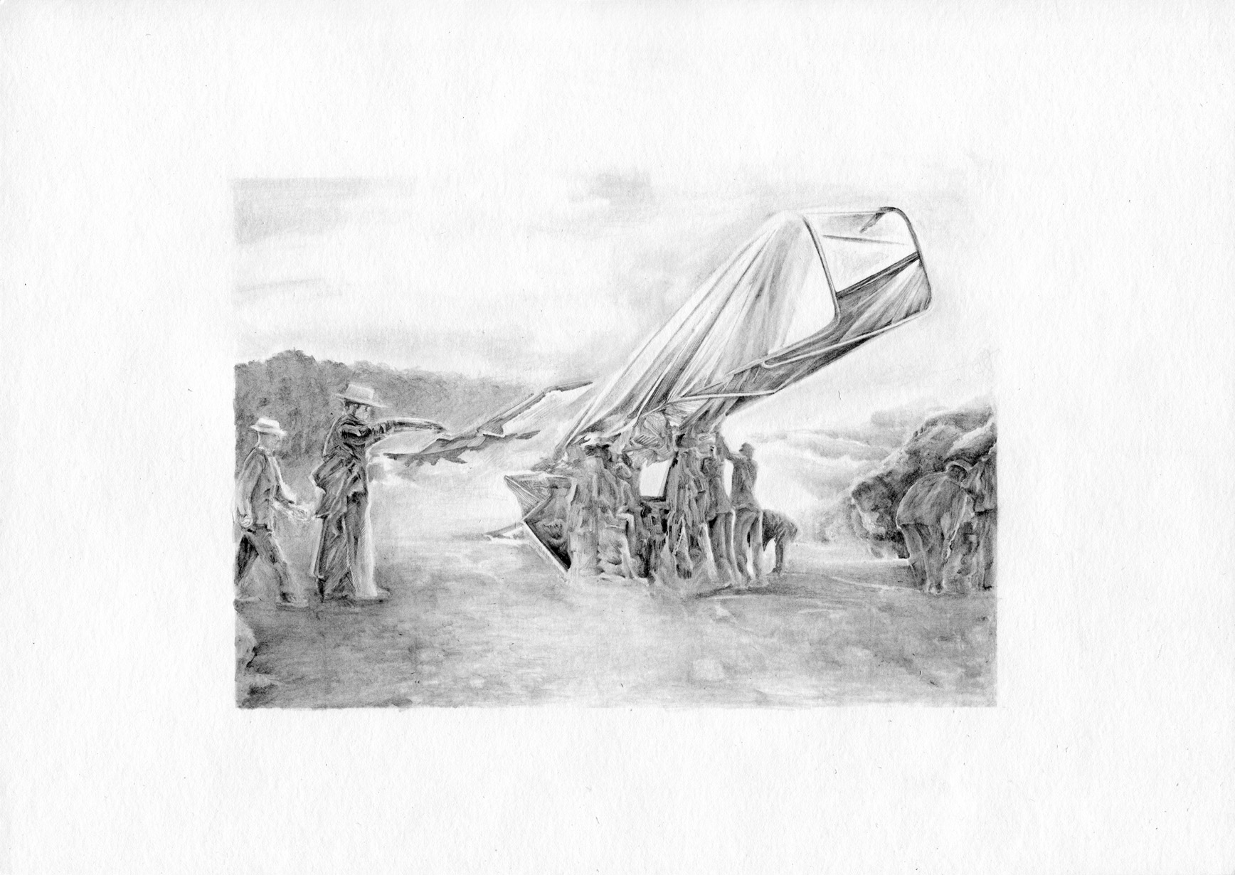 This series is a playful exploration of shifting photographic images. The reference images are old photos, the oldest at something, like the first photographic documentation of a fatal air crash, the first photography of the moon, et cetera. My idea of working with historic photography was to play with what informs my interpretation of the images and the ambiguity of the image.