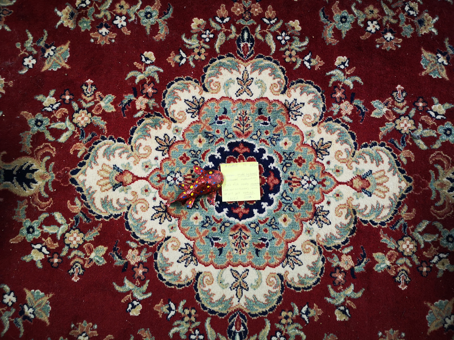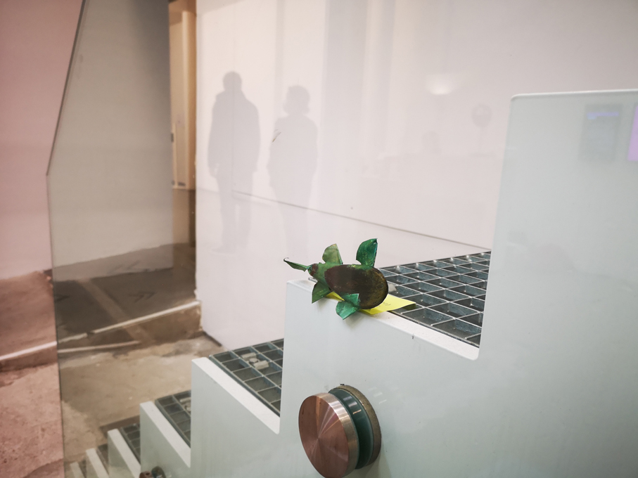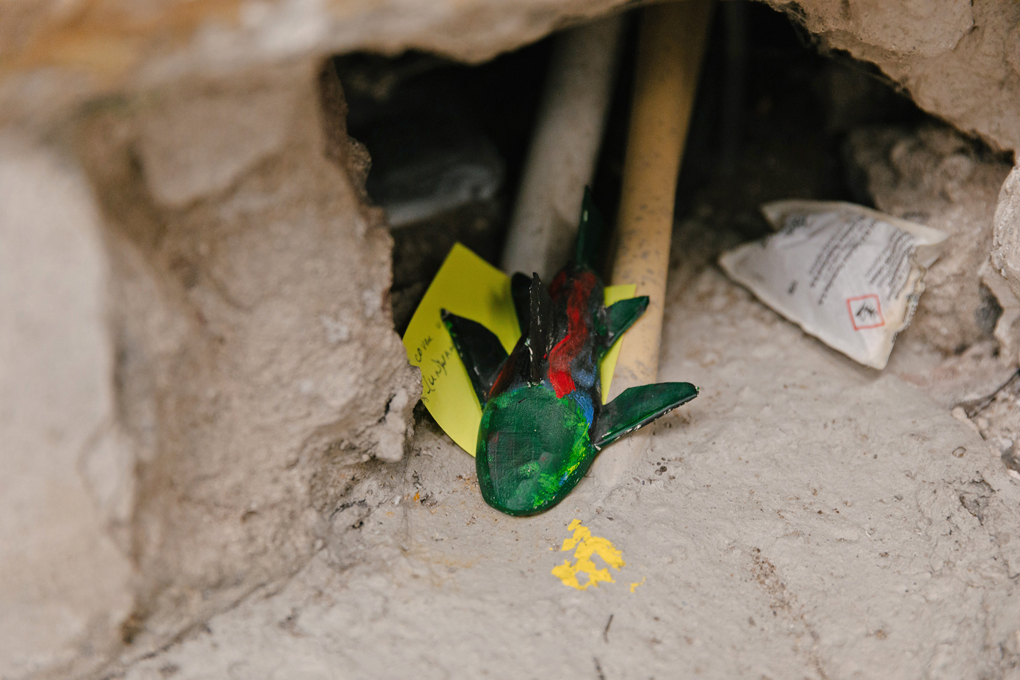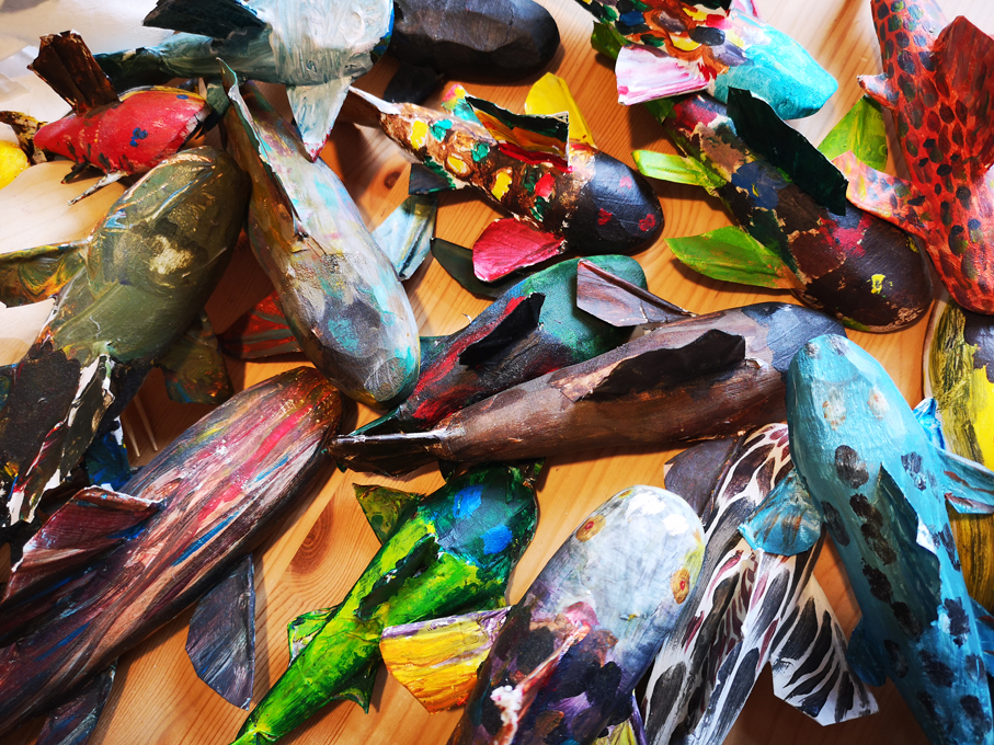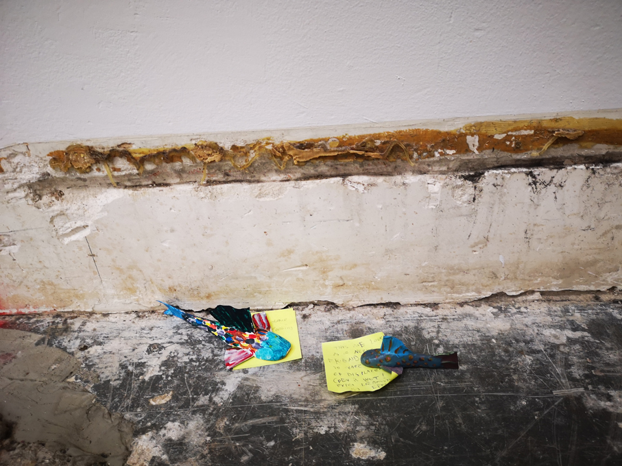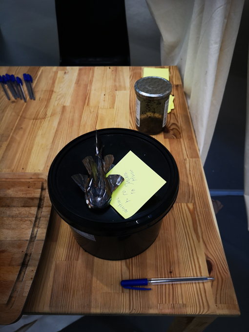 These devil’s fishes where crafted together with my partner and children, using left-over material from previous work. Here you’ll find some images of the fishes after the workshop -performance, where the participants found a place for the fishes, together with a post-it with written motives, to belong to.