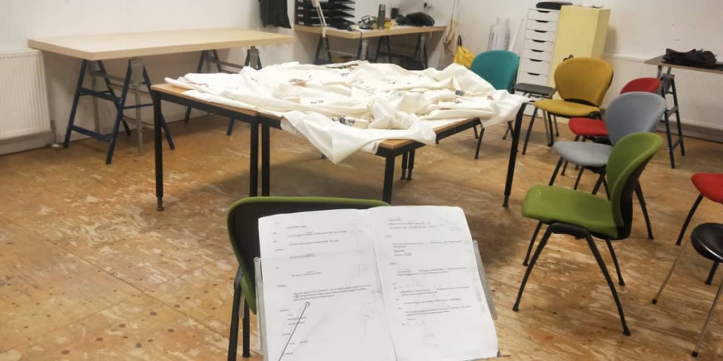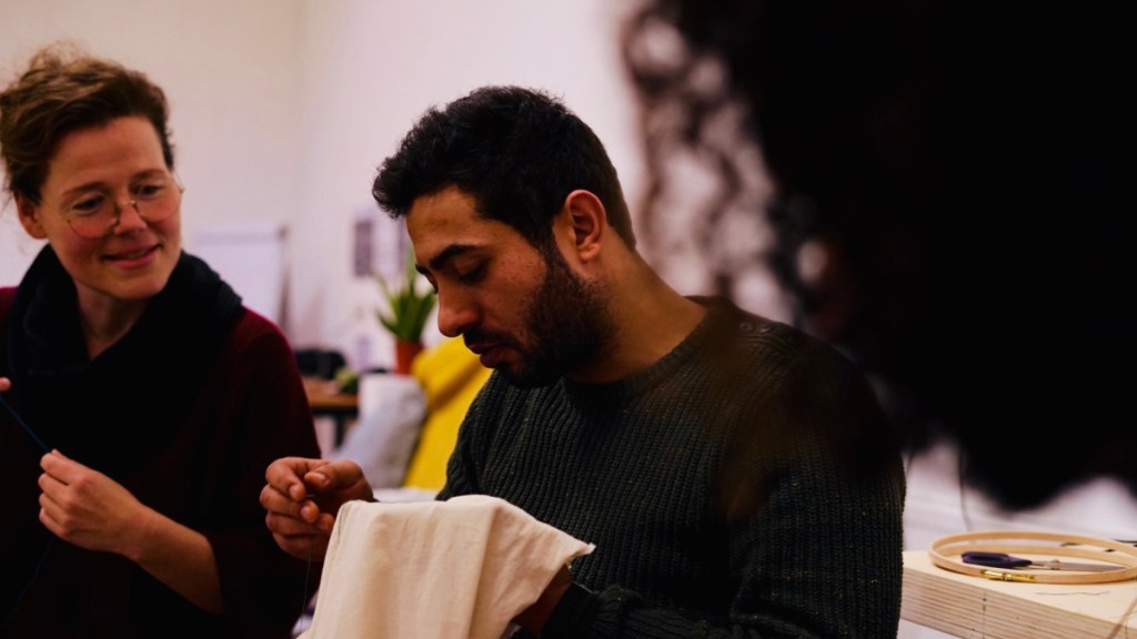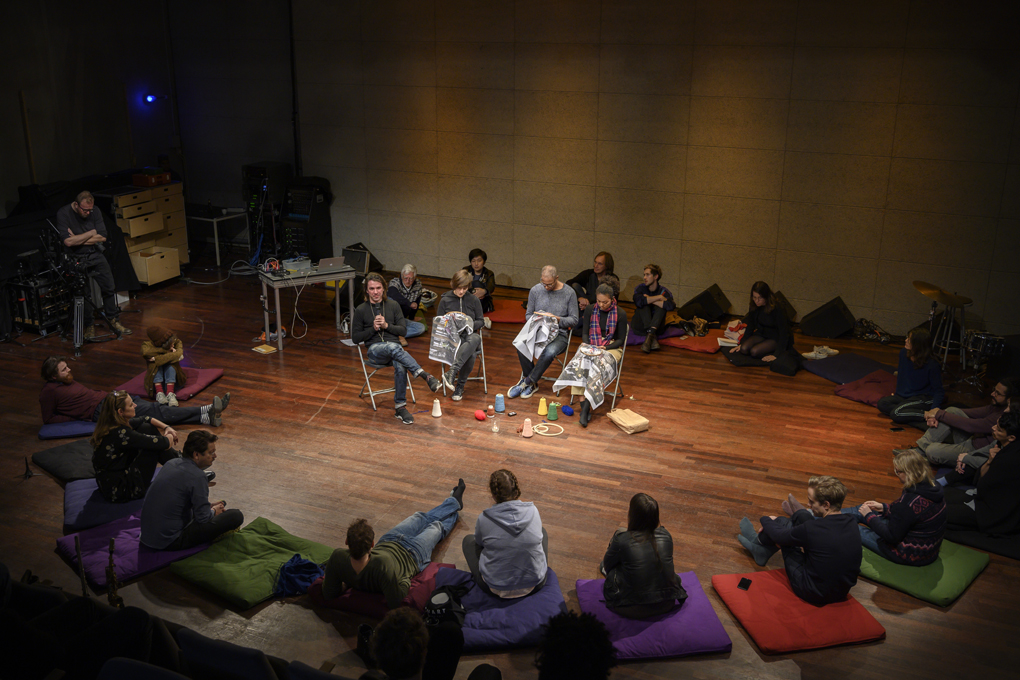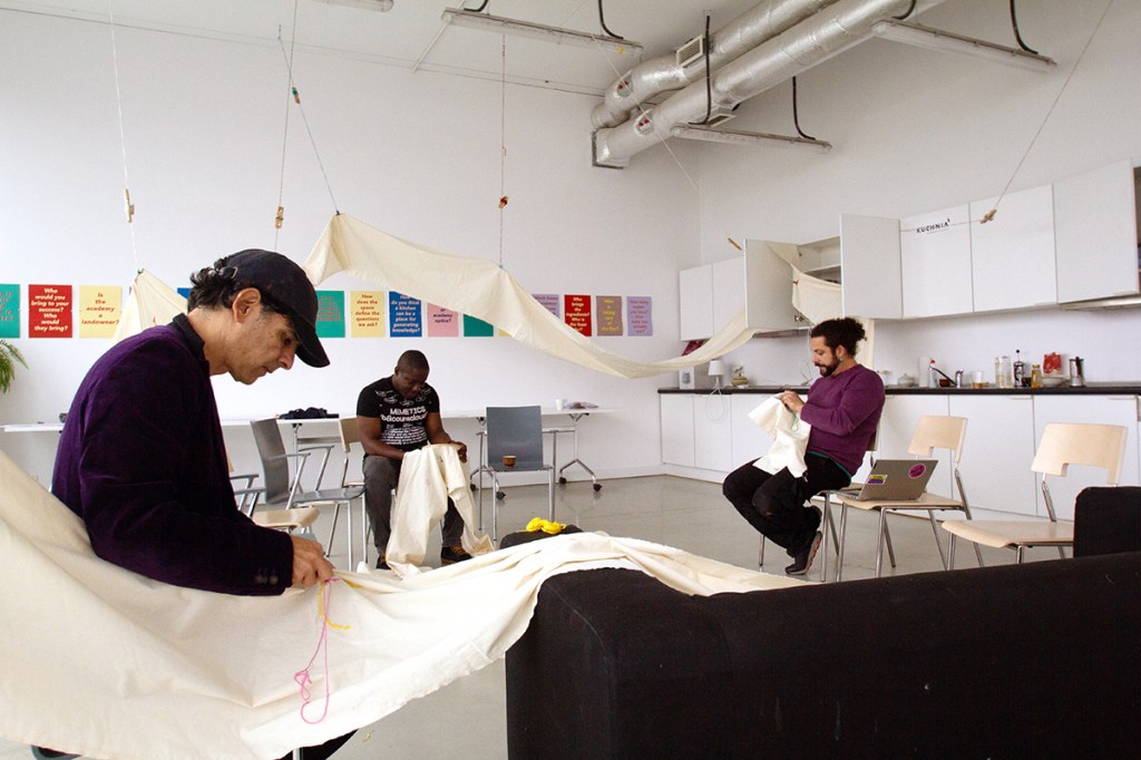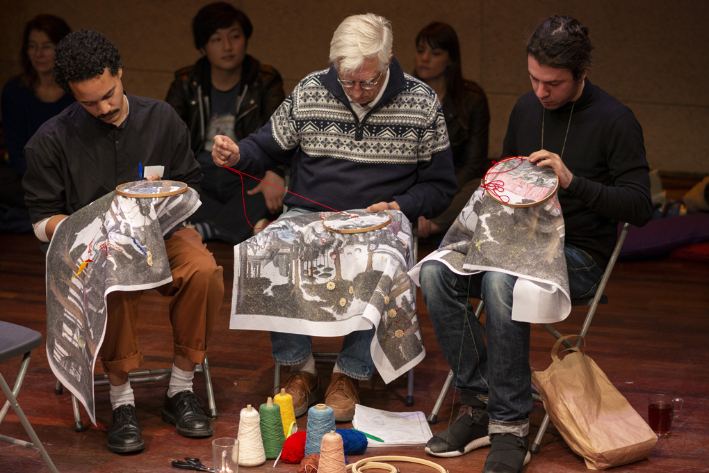 Collective embroidery, conversations around futures with belonging and music. Open Day, HKU 2019. Photo: Alan Heiblum