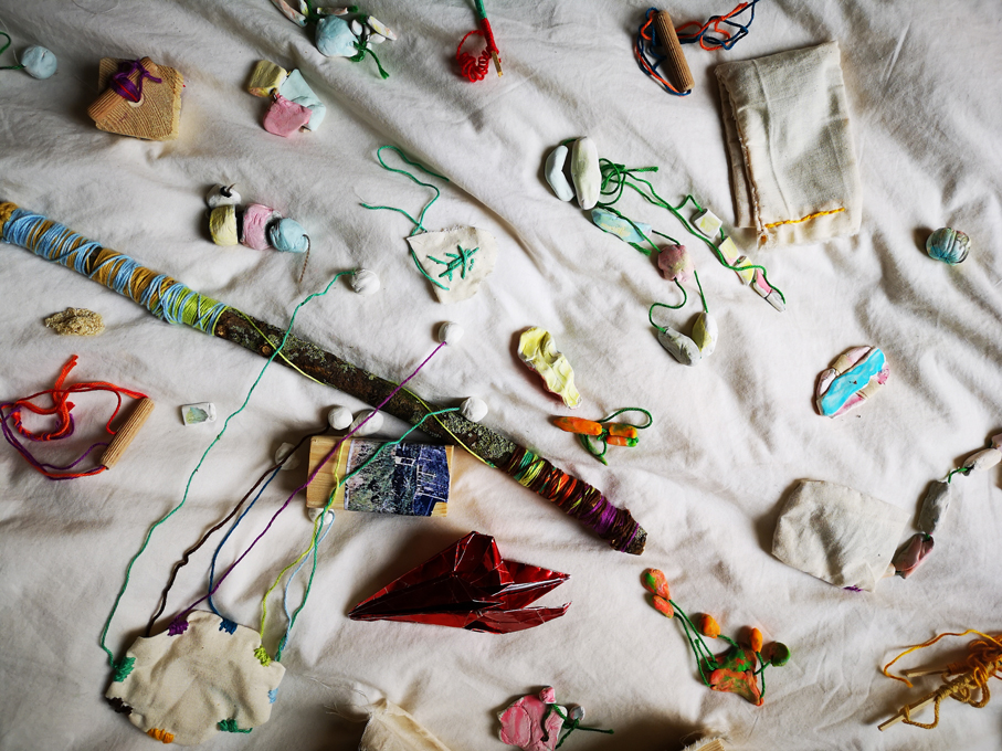 Objects displayed on the fabric for Aguila Devorando Serpiente, Performance, Objects, the fabric, slides projection and accordion. UU, 2020