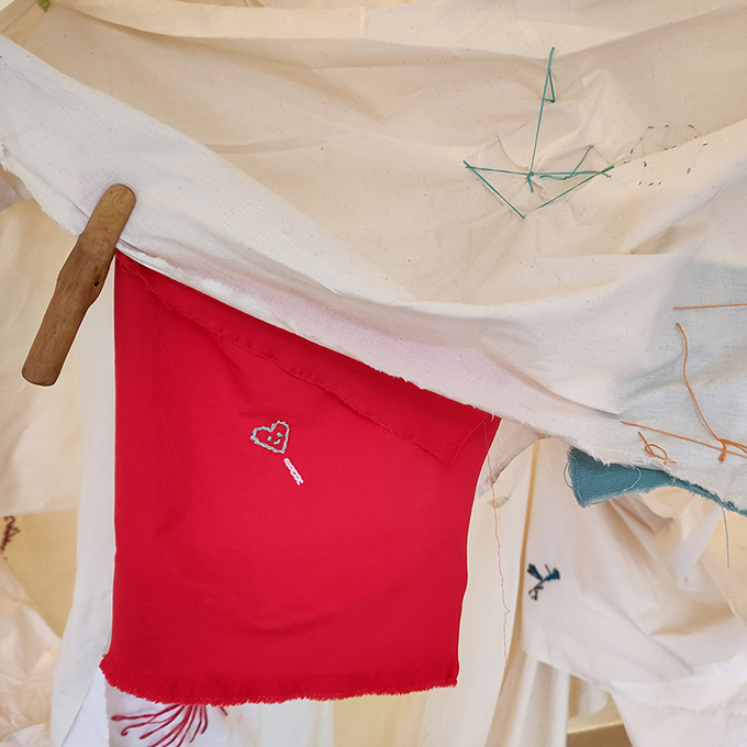 A large piece of raw canvas (approximately 50m x 1m), has been a medium to work collaboratively with embroidery, applique, patchwork, fabric origami, among others, but also a way to work with space to display, accompany and to host. To me this fabric fulfills the role of an ever-changing archive, partly as a diary, as a way to stay with the trouble, and a reminder of relational make-up that builds my practice and me as a person.